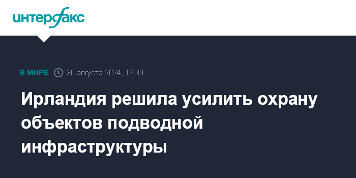 Москва. 30 августа. INTERFAX.RU - Власти Ирландии собираются более внимательно отслеживать ситуацию на морях вокруг страны и уделять больше внимания защите объектов подводной инфраструктуры, сообщает издание Defense news.