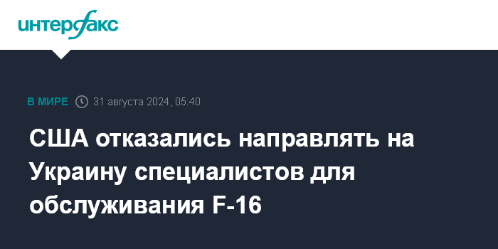 Москва. 31 августа. INTERFAX.RU - Американская администрация по соображениям безопасности не будет направлять на Украину гражданских специалистов для обслуживания полученных Киевом самолетов F-16 и другой американской военной техники, сообщает The Wall Street Journal со ссылкой на осведомленные источники.
