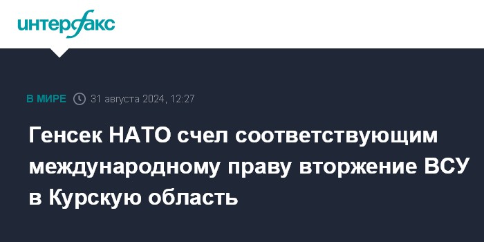 Москва. 31 августа. INTERFAX.RU - Вторжение украинских войск в Курскую область России соответствует международному праву и праву Украины на самооборону, заявил генеральный секретарь НАТО Йенс Столтенберг немецким СМИ.