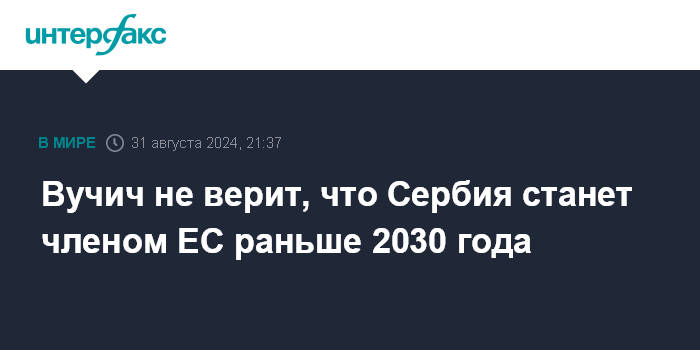Москва. 31 августа. INTERFAX.RU - Президент Сербии Александр Вучич в субботу заявил, что ЕС вряд ли примет его страну в свой блок в ближайшие шесть лет.