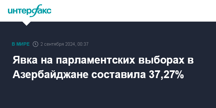 Москва. 2 сентября. INTERFAX.RU - В ЦИК Азербайджана заявили, что явка на внеочередных парламентских выборах составила 37,27%.