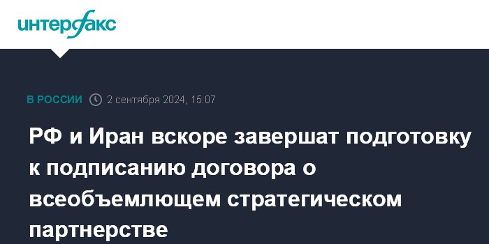 Москва. 2 сентября. INTERFAX.RU - Москва и Тегеран в самое ближайшее время завершат подготовку к подписанию договора о всеобъемлющем стратегическом партнерстве, сообщил в понедельник глава МИД РФ Сергей Лавров.
