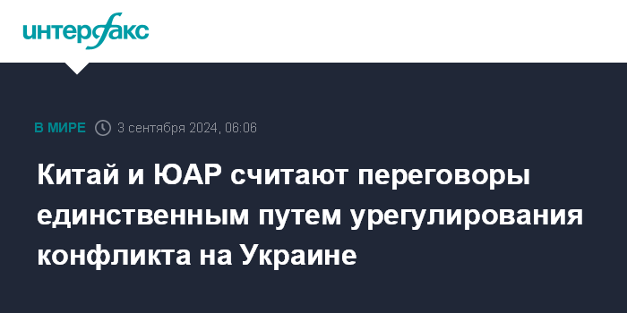 Москва. 3 сентября. INTERFAX.RU - Китай и Южно-Африканская Республика считают, что урегулирование украинского конфликта на долгосрочной основе возможно только путем переговоров.