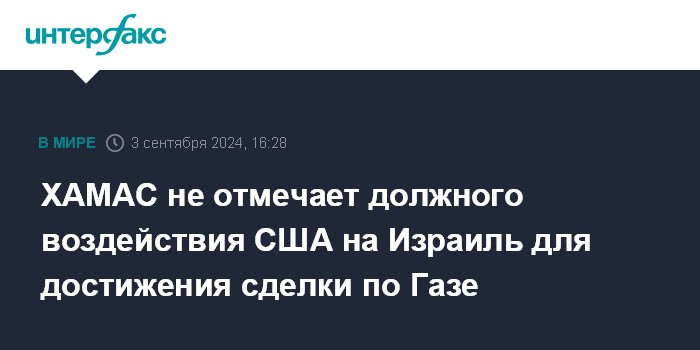 Москва. 3 сентября. INTERFAX.RU - Движение ХАМАС заявило МИД Турции, что США прилагают недостаточно усилий по работе с Израилем для заключения соглашения о прекращении огня в секторе Газа и освобождении заложников, сообщает "Анадолу".