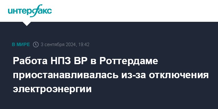 Москва. 3 сентября. INTERFAX.RU - Отключение электроэнергии в районе порта Роттердама во вторник привело к краткосрочной приостановке работы крупнейшего нефтеперерабатывающего предприятия BP Plc в Европе.