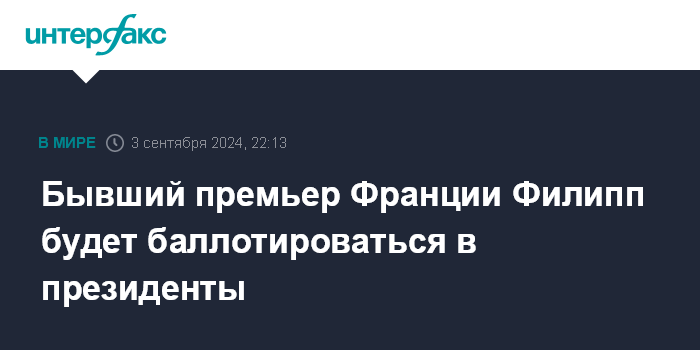 Москва. 3 сентября. INTERFAX.RU - Бывший премьер-министр Франции Эдуар Филипп объявил во вторник о решении участвовать в президентских выборах в 2027 году.