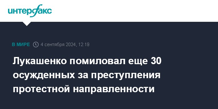 Москва. 4 сентября. INTERFAX.RU - Президент Белоруссии Александр Лукашенко помиловал еще 30 осужденных за преступления, связанные с протестами после президентских выборов 2020 года.