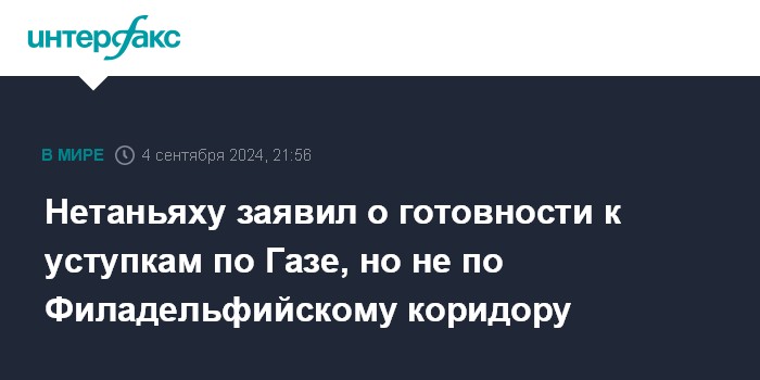 Москва. 4 сентября. INTERFAX.RU - Израиль готов проявлять гибкость для заключения сделки с ХАМАС по перемирию и освобождению заложников, но Филадельфийский коридор покидать не намерен, заявил в среду премьер-министр Израиля Биньямин Нетаньяху.