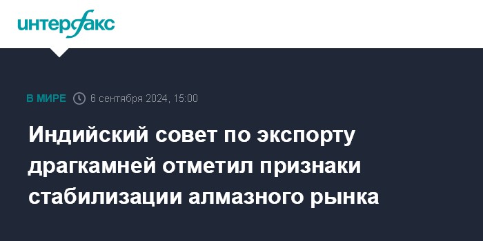 Москва. 6 сентября. INTERFAX.RU - В алмазной отрасли после 18 месяцев коррекции наметились явные признаки восстановления и ценовой стабильности, считает глава Совета по содействию экспорту драгоценных камней и ювелирных изделий Индии (Gem & Jewellery Export Promotion Council, GJEPC) Випул Шах. Письмо Шаха участникам отрасли цитирует агентство Rapaport.