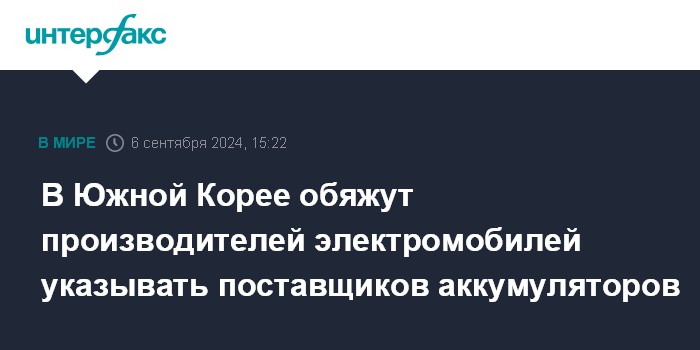 Москва. 6 сентября. INTERFAX.RU - Правительство Южной Кореи намерено обязать производителей электромобилей раскрывать информацию о поставщиках аккумуляторов к ним, пишет Financial Times.