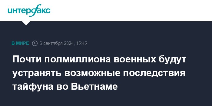 Москва. 6 сентября. INTERFAX.RU - Во Вьетнаме задействуют порядка 460 тыс. военных в рамках подготовки к последствиям от тайфуна "Яги", который может обрушиться на севере страны в субботу, 7 сентября, сообщают местные СМИ. Для устранения последствий циклона развернули 457,4 тыс. военнослужащих, включая почти 100 тыс. солдат, 319 тыс. сил гражданской обороны и 39,3 тыс. резервных сил. Кроме того, задействуют более 10 тыс. единиц транспорта.