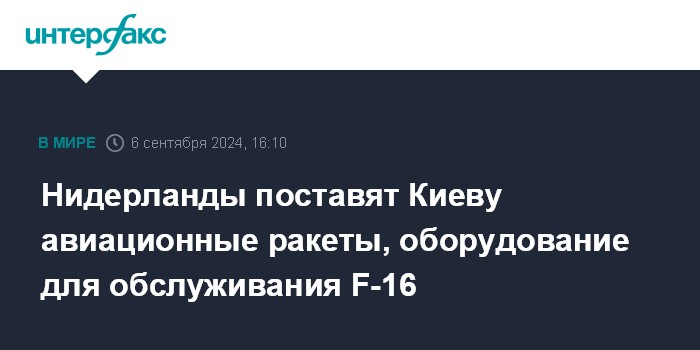 Москва. 6 сентября. INTERFAX.RU - Министр обороны Нидерландов Рубен Брекелманс в пятницу заявил о намерении поставить Киеву ракеты класса "воздух-воздух", а также оборудование и материалы, нужные для поддержания боеспособности истребителей F-16, говорится в пресс-релизе нидерландского Минобороны.