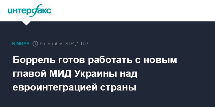 Москва. 6 сентября. INTERFAX.RU - Глава дипломатии ЕС Жозеп Боррель в пятницу заявил о готовности работать с новым главой украинского МИД Андреем Сибигой над вопросом присоединения Украины к ЕС.