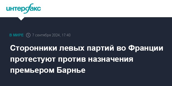 Москва. 7 сентября. INTERFAX.RU - Сторонники левых партий проводят в субботу акции протеста во Франции против назначения премьер-министром Мишеля Барнье, сообщают парижские СМИ.