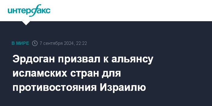 Москва. 7 сентября. INTERFAX.RU - Президент Турции Реджеп Тайип Эрдоган в субботу заявил, что исламским странам необходимо объединяться для противостояния Израилю, сообщают турецкие СМИ.