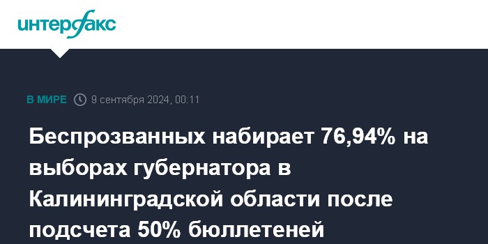 Москва. 9 сентября. INTERFAX.RU - На выборах губернатора Калининградской области подсчитано 50,2% избирательных бюллетеней, побеждает врио главы региона Алексей Беспрозванных, выдвинутый "Единой Россией", он набирает 76,94% голосов, следует из данных онлайн-табло в информационном центре ЦИК.