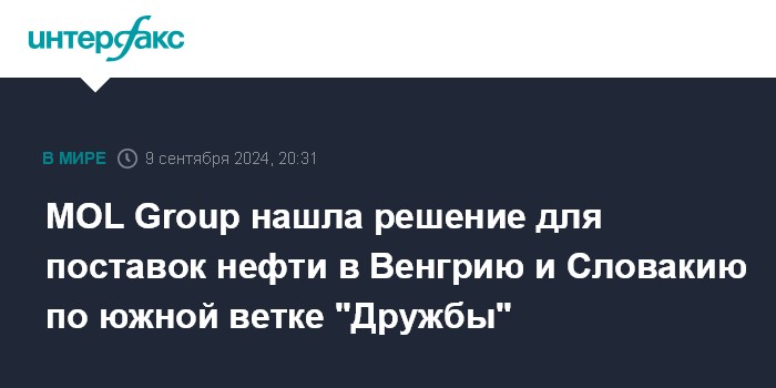 Москва. 9 сентября. INTERFAX.RU - MOL Group заключила соглашения с поставщиками нефти и операторами трубопроводов для обеспечения непрерывной транспортировки сырья по трубопроводу "Дружба" через Белоруссию и Украину в Венгрию и Словакию, сообщает компания.