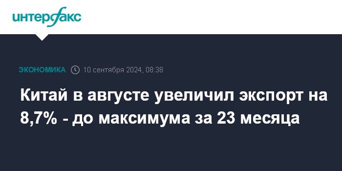 Москва. 10 сентября. INTERFAX.RU - Китай в августе увеличил экспорт на 8,7% в годовом выражении - до $308,65 млрд, сообщило Главное таможенное управление КНР. Показатель достиг максимума за 23 месяца. Прирост был самым значительным с марта 2023 года.