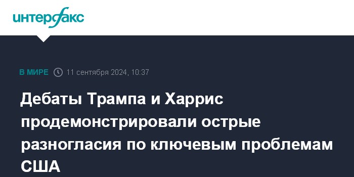 Москва. 11 сентября. INTERFAX.RU - Состоявшиеся дебаты кандидатов в президенты США - Дональда Трампа и Камалы Харрис - стали свидетельством разногласий по ключевым проблемам внутренней и внешней политики страны.