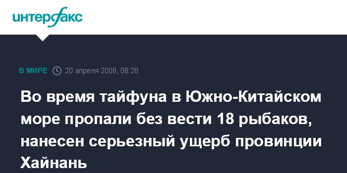Пекин. 20 апреля. ИНТЕРФАКС-КИТАЙ - После тайфуна "Неогури", который обрушился на южные районы Китая в пятницу и субботу, пропали без вести 18 китайских рыбаков, самой южной китайской провинции Хайнань нанесен экономический ущерб, который оценивается в 337 млн юаней ($48,1 млн), сообщили в воскресенье местные СМИ.