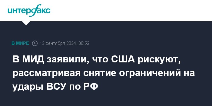 Москва. 12 сентября. INTERFAX.RU - Заявление Вашингтона о том, что рассматривается вопрос о снятии ограничений на удары Вооруженных сил Украины (ВСУ) вглубь России, добавят рисков самим США, сказал заместитель министра иностранных дел РФ Сергей Рябков.