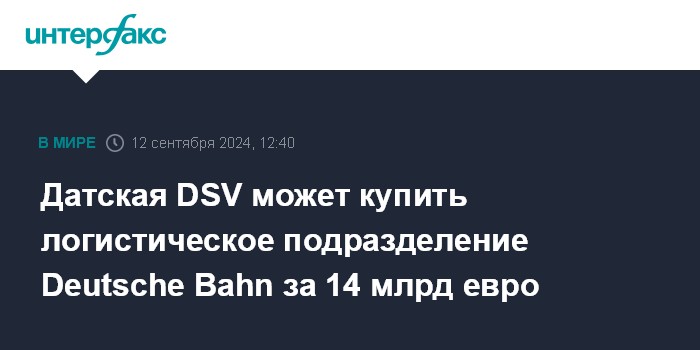 Москва. 12 сентября. INTERFAX.RU - Датский холдинг DSV находится на продвинутой стадии переговоров о покупке DB Schenker, логистического подразделения германского государственного железнодорожного оператора Deutsche Bahn, за 14 млрд евро. Об этом сообщает Bloomberg со ссылкой на информированные источники.