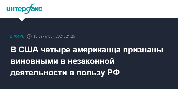 Москва. 12 сентября. INTERFAX.RU - Суд присяжных в США в четверг признал четырех американских граждан виновными в сговоре с целью ведения незаконной деятельности на территории страны в интересах России, сообщили в Минюсте.
