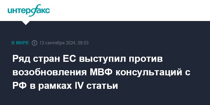 Москва. 13 сентября. INTERFAX.RU - Ряд стран Евросоюза намерены оспорить решение руководства Международного валютного фонда возобновить ежегодные консультации с российскими экономическими властями в рамках IV статьи устава фонда, приостановленные после начала конфликта на Украине, сообщает агентство Bloomberg со ссылкой на источники.
