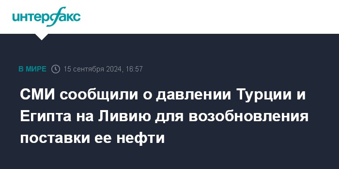 Москва. 15 сентября. INTERFAX.RU - Турция и Египет, ранее поддержавшие разные стороны конфликта в Ливии, теперь пытаются повлиять на них, чтобы преодолеть внутренний кризис и восстановить поставки нефти из страны, сообщает в воскресенье Bloomberg со ссылкой на источники.