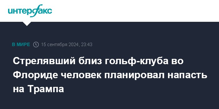 Москва. 15 сентября. INTERFAX.RU - Вооруженный человек, открывший стрельбу у гольф-клуба во Флориде, в котором находился Дональд Трамп, планировал напасть на экс-президента США, сообщает в воскресенье CNN со ссылкой на источники.