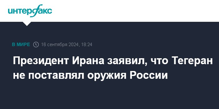 Москва. 16 сентября. INTERFAX.RU - Президент Ирана Масуд Пезешкиан в понедельник заявил, что Тегеран не передавал России никакого оружия, сообщает агентство Mehr.