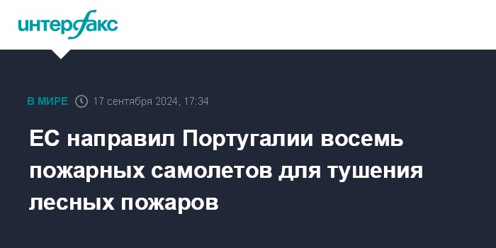 Москва. 17 сентября. INTERFAX.RU - В связи с сильными лесными пожарами на севере Португалии власти страны активировали механизм гражданской защиты ЕС и получили в помощь восемь пожарных самолетов из Испании, Италии, Франции и Греции, сообщила Еврокомиссия (ЕК).