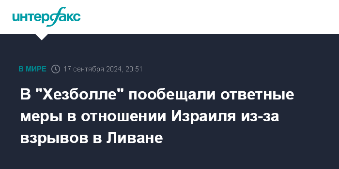 Москва. 17 сентября. INTERFAX.RU - В ливанском шиитском движении "Хезболла" возложили на Израиль ответственность за взрывы в Ливане и пообещали принять ответные меры, сообщают во вторник ближневосточные СМИ.
