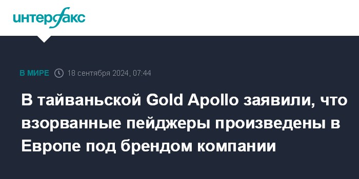 Москва. 18 сентября. INTERFAX.RU -Тайваньская компания Gold Apollo не производила пейджеры, которые были подорваны в Ливане, заявил журналистам основатель компании Су Цинкуан.