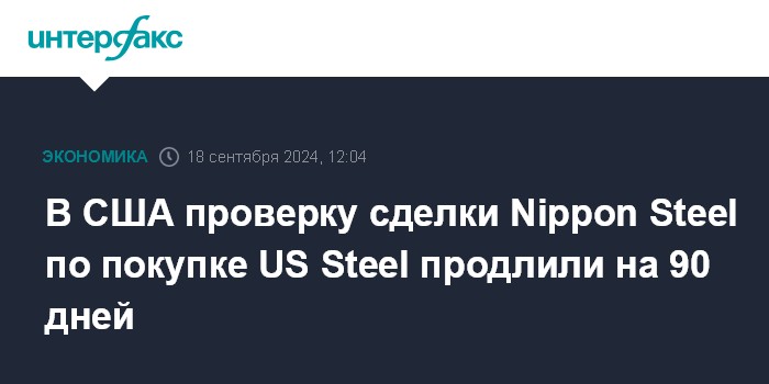 Москва. 18 сентября. INTERFAX.RU - Комитет по иностранным инвестициям в Соединенных Штатах (CFIUS) продлил на 90 дней проверку сделки по покупке американской сталелитейной компании United States Steel Corp. (US Steel) на предмет угрозы национальной безопасности, пишет Financial Times со ссылкой на информированные источники. Покупатель - японская Nippon Steel.