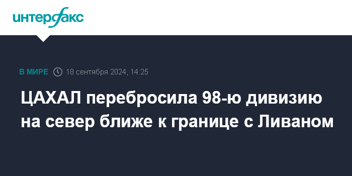 Москва. 18 сентября. INTERFAX.RU - Командование Армии обороны Израиля (ЦАХАЛ) в обстановке разрастания конфликта с движением "Хезболла" передислоцировало на север страны ближе к Ливану 98-ю дивизию, сообщает в среду The Times of Israel.
