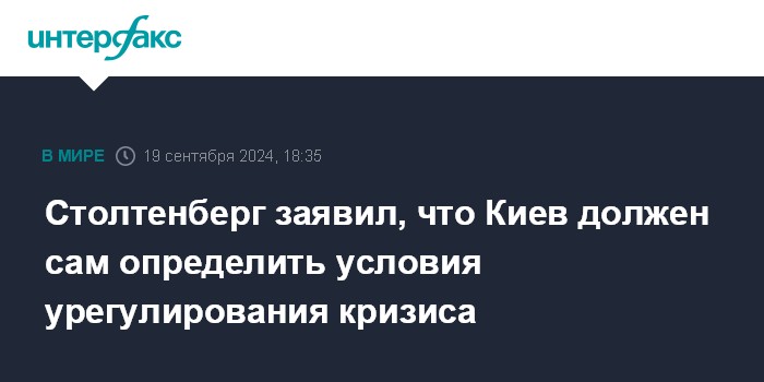 Москва. 19 сентября. INTERFAX.RU - Руководство Украины само, без НАТО, должно решить, какие условия урегулирования украинского кризиса следует считать приемлемыми, сообщил в четверг генсек альянса Йенс Столтенберг.