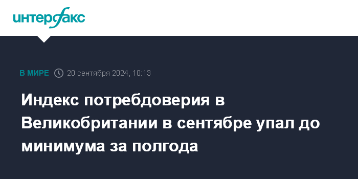 Москва. 20 сентября. INTERFAX.RU - Индекс потребительского доверия в Великобритании в сентябре опустился до минимального уровня за полгода.