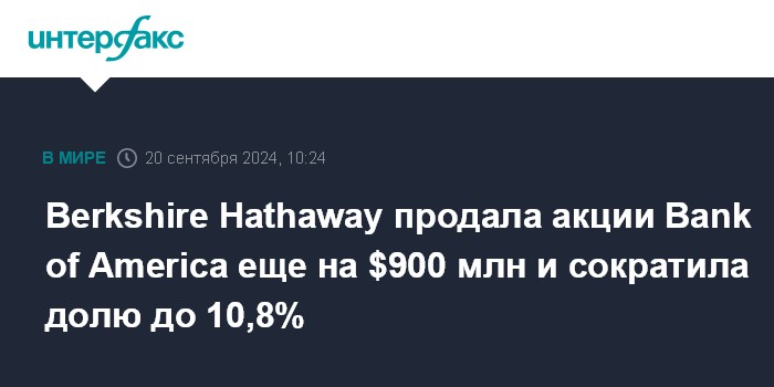 Москва. 20 сентября. INTERFAX.RU - Инвестиционная компания американского миллиардера Уоррена Баффета Berkshire Hathaway продолжила сокращать свой пакет в Bank of America Corp.