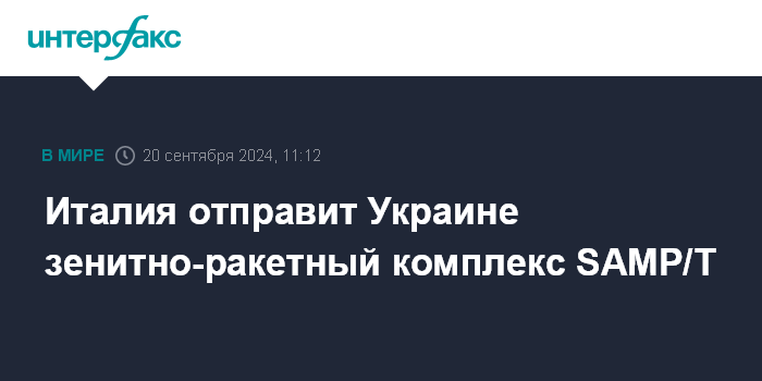Москва. 20 сентября. INTERFAX.RU - Италия намерена вскоре передать Украине еще один зенитный ракетный комплекс (ЗРК) SAMP/T заявил глава итальянского МИД Антонио Таяни.