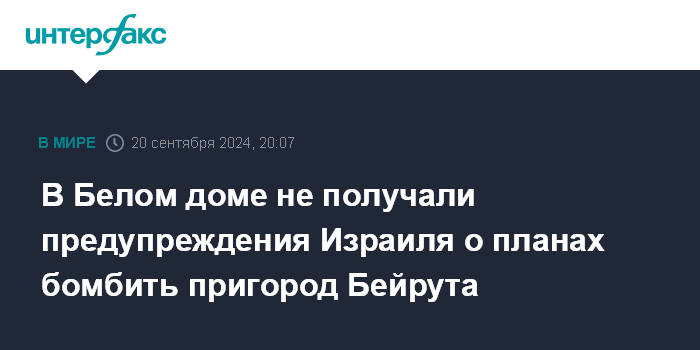 Москва. 20 сентября. INTERFAX.RU - США не знали о намерении израильской армии нанести авиаудары по пригороду Бейрута, нацеленные на лидера элитного подразделения ливанского шиитского движения "Хезболла" "Радван" Ибрагима Акиля, заявил советник Белого дома Джон Кирби. Его слова приводит Guardian.