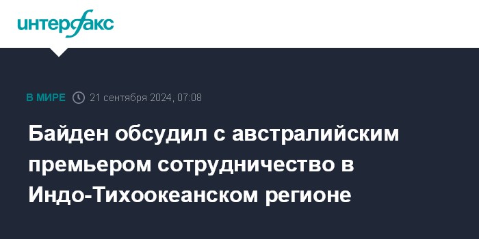 Москва. 21 сентября. INTERFAX.RU - Президент США Джо Байден на встрече с премьер-министром Австралии Энтони Альбанезе, прошедшей в Уилмингтоне (штат Делавэр) затронули вопросы двустороннего сотрудничества и партнерства в Индо-Тихоокеанском регионе, сообщил Белый дом.