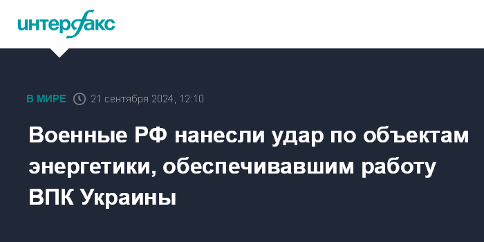 Москва. 21 сентября. INTERFAX.RU - Вооруженные силы России ночью нанесли удар по объектам энергетики, обеспечивающим работу предприятий военно-промышленного комплекса и военным объектам Украины, сообщило Минобороны РФ в субботу.