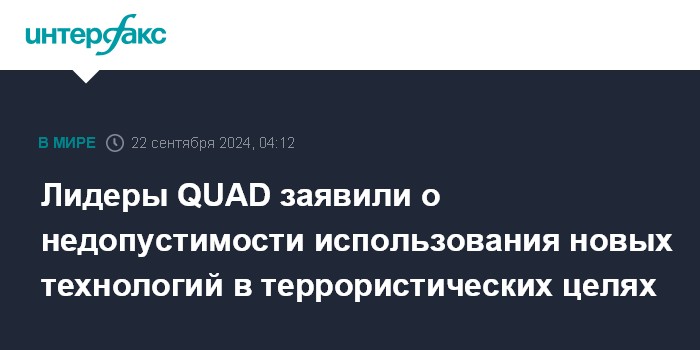 Москва. 22 сентября. INTERFAX.RU - Лидеры США, Австралии, Индии и Японии (страны, входящие в Четырехсторонний диалог по вопросам безопасности (QUAD)) заявили о важности развития сотрудничества в области борьбы с терроризмом и недопустимости использования новых технологий в террористических целях.