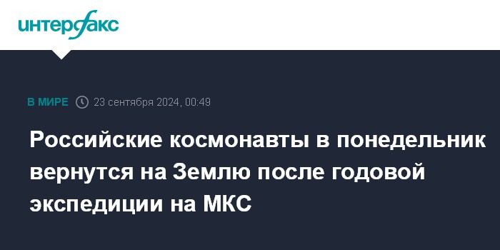 Москва. 23 сентября. INTERFAX.RU - Спускаемый аппарат корабля "Союз МС-25" с космонавтами "Роскосмоса" Олегом Кононенко, Николем Чубом и астронавтом NASA Трейси Дайсон, как ожидается, в понедельник приземлится в Казахстане.