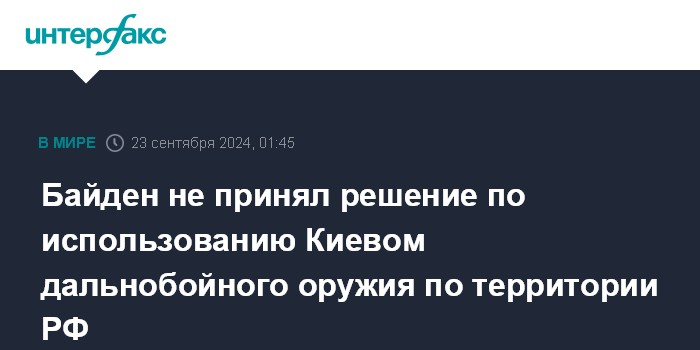 Москва. 23 сентября. INTERFAX.RU - Президент США Джо Байден сообщил, что пока не принял решение в отношении снятия ограничений на использование Украиной дальнобойного оружия для ударов по территории России.