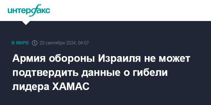 Москва. 23 сентября. INTERFAX.RU - Армия обороны Израиля заявила, что не может ни подтвердить, ни опровергнуть сообщения о возможной смерти главы политбюро палестинского движения ХАМАС Яхья Синвара, сообщает The Jerusalem Post.