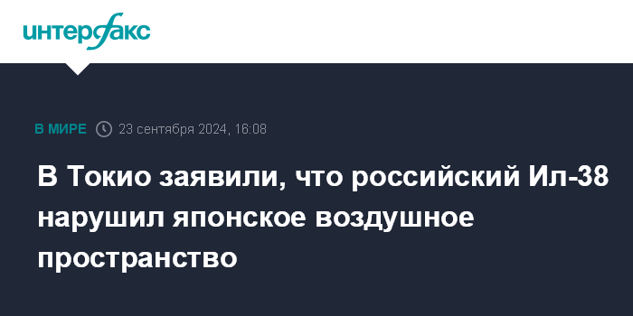 Москва. 23 сентября. INTERFAX.RU - В японском Минобороны заявили, что российский противолодочный самолет Ил-38 нарушил воздушное пространство Японии, сообщает в понедельник Kyodo.