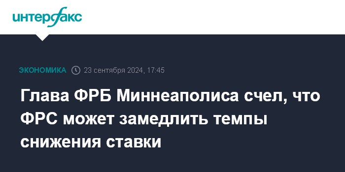 Москва. 23 сентября. INTERFAX.RU - Федеральная резервная система (ФРС), на прошлой неделе понизившая ключевую процентную ставку сразу на 50 базисных пунктов, может замедлить темпы смягчения денежно-кредитной политики, полагает глава Федерального резервного банка (ФРБ) Миннеаполиса Нил Кашкари.