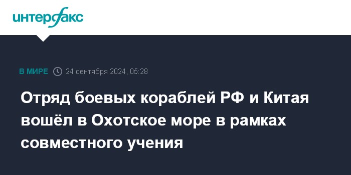 Москва. 24 сентября. INTERFAX.RU - Отряд боевых кораблей Тихоокеанского флота и ВМС Китая в рамках российско-китайского военно-морского учения "Бэйбу/Взаимодействие - 2024" форсировал пролив Лаперуза и вошёл в Охотское море, сообщила пресс-служба ТОФ.